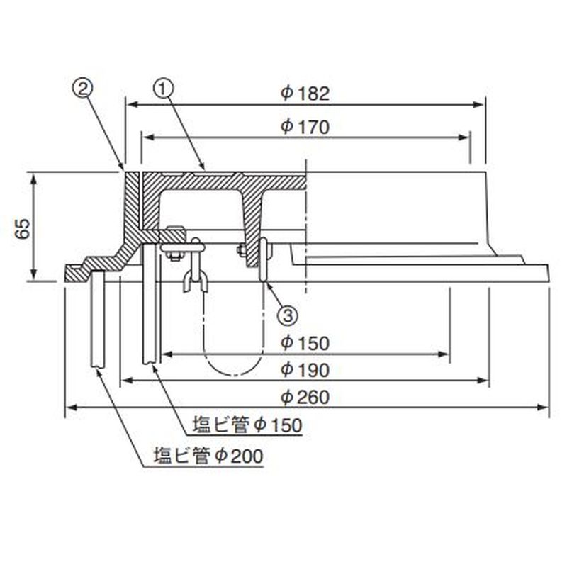 受枠に塩ビ管(VP,VUΦ150,Φ200)がセットできます。