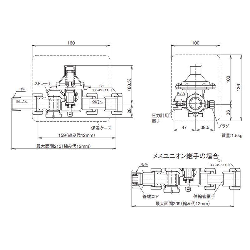 ユニオン継手(パイプ・ナット・ガスケット)、保温ケース(自己消火性)、テストガグ、圧力計用継手(二次側用で、本体取付け済み)