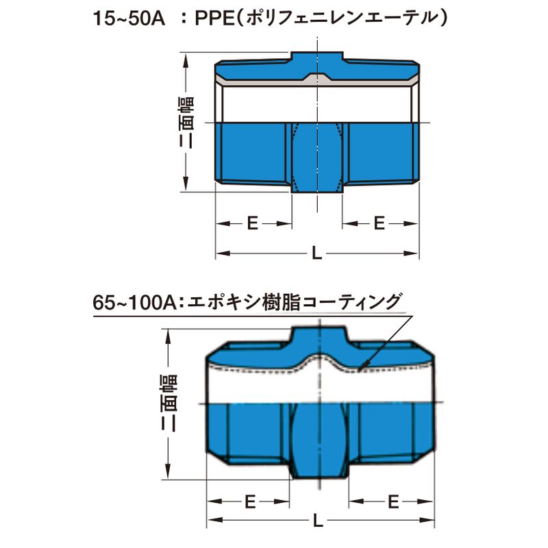 PPE樹脂一体射出成形防食部を内蔵し、不乾性シーラントをねじ部に注入。腐食の原因となる鉄地の露出が一切なく、接水部は全てPPE樹脂のため赤水を完全に防ぎます。