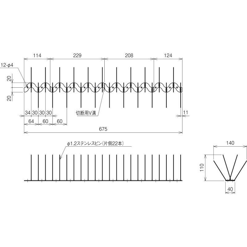 W型の広がりを持つピンにより、少ない設置スペース(40mm)で、広い着地防止範囲(140mm)を確保します。