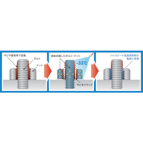凍結収縮してサビを割るフリーズ&クラックアクションとハイスピード浸透潤滑剤のダブル効果により、サビで固着したネジやボルト・ナットをなめずに簡単に取り外すことができます。