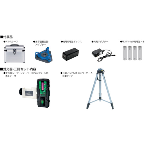 アルミケース、水平調整三脚アダプター、充電電池ボックス、充電アダプター、レーザーメガネ、単三アルカリ電池×4本