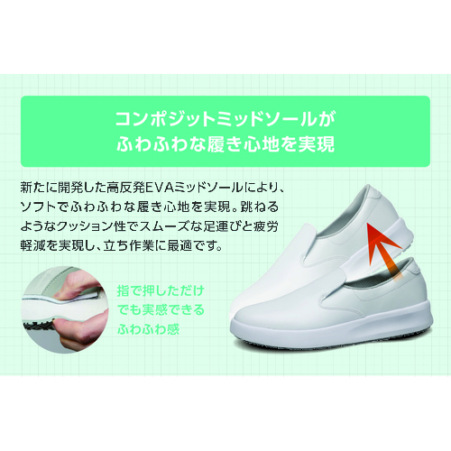 跳ねるようなクッション性でスムーズな足運びと疲労軽減を実現し、立ち仕事に最適です。