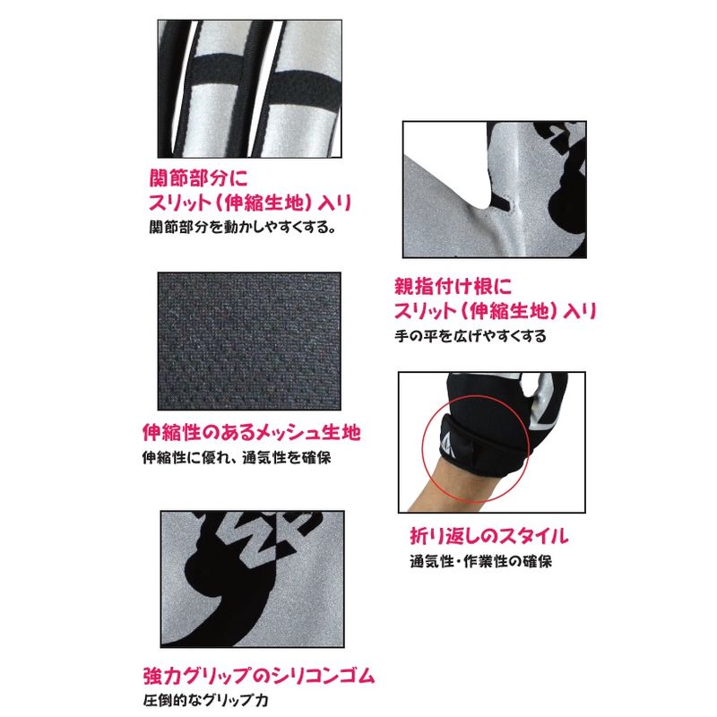 親指付け根にスリット(伸縮生地)入り。手の平を広げやすくする。