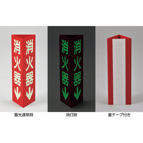 013104 消防標識 消火器↓ 三角柱・蓄光タイプ 消火器D(大) 300x100mm三角 エンビ
