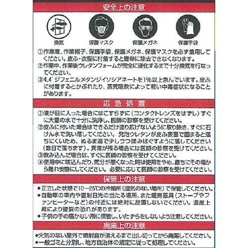 本品は20℃前後でのご使用が最適です。低温下(5℃以下)では十分な発泡や正常な硬化をしませんので、1一日以上室温下(20℃前後)で保管後ご使用くださいませ。