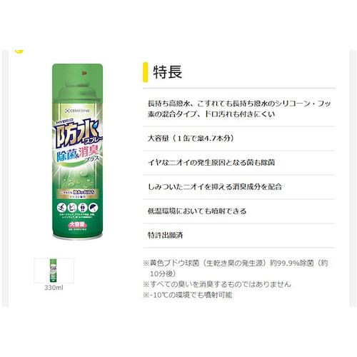 ハイブリッド成分で防水・除菌・消臭・防汚の効果を発揮します。●こすれても長持ち、高撥水のフッ素・シリコーンの混合タイプ、ドロ汚れも付きにくい製品です。●嫌なニオイの発生原因となる菌も除菌します。●しみついたニオイを抑える消臭成分を配合しています。●ハイブリッドなセメダインの防水スプレー除菌&消臭プラス 330ml 【品番 HC-026】です。●大容量330mlですので、雨傘で約4.7本分使えます。●洗濯しにくいウェア、湿気で臭くなりやすい製品など、いろいろとお試しください。●詳細につきましては、左下のMOVIE:動画をクリックしてご覧ください。●低温環境においても噴射可能です。