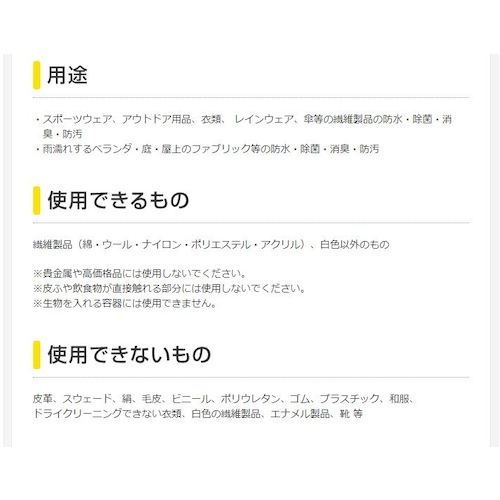 スポーツウェア、アウトドア用品、衣類、レインウェア、傘等の繊維製品の防水・除菌・招集・防汚に。