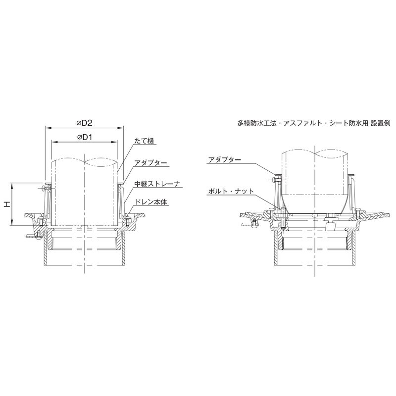 アスファルト・シート防水用の本体に使用する際は、防水層押えを固定しているボルト・ナットの内側にアダプターを入れてください。