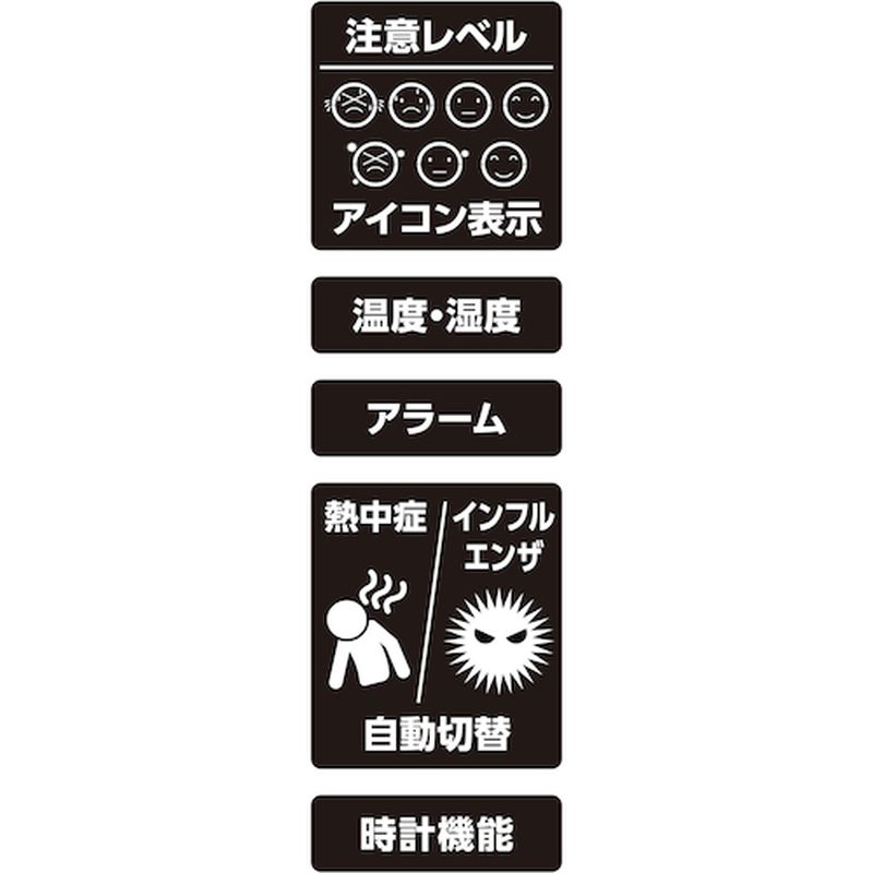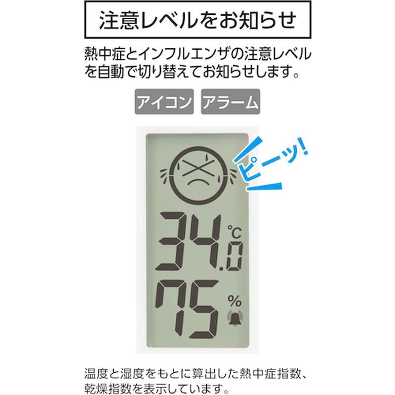熱中症、インフルエンザの注意レベルを環境に合わせて自動で切り替え、アイコンと文字、アラームでお知らせします。