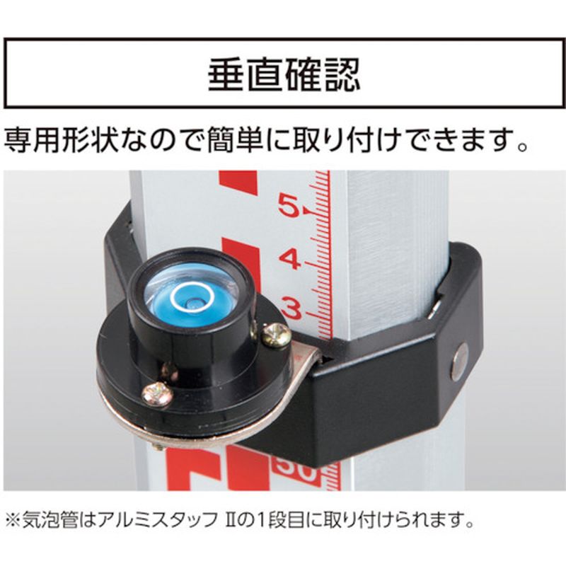 アルミスタッフ 2 シリーズの1段目にワンタッチで取り付けることができ、手軽にスタッフの垂直の目安を確認できます。