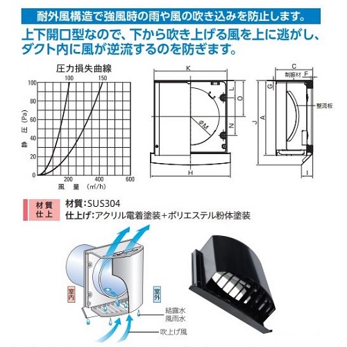上下開口型なので、下から吹き上げる風を上に逃がし、ダクト内に風が逆流するのを防ぎます。