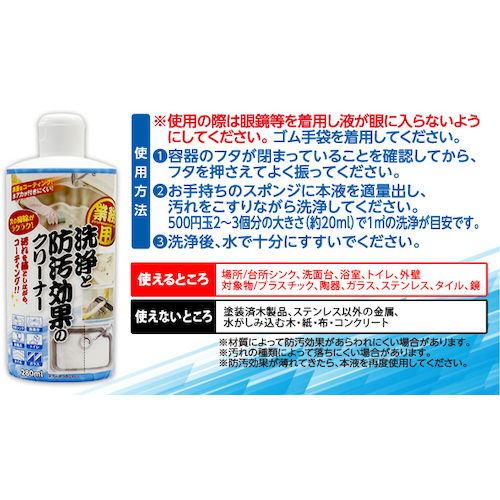 <使えるところ>場所/台所シンク、洗面台、浴室、トイレ、外壁対象物/プラスチック、陶器、ガラス、ステンレス、タイル、鏡<使えないところ>塗装済木製品、ステンレス以外の金属、水がしみ込む木・紙・布・コンクリート適するもの:陶器、ガラス、ステンレス、プラスチック製のシンク、洗面台、浴室、トイレ、外壁に。